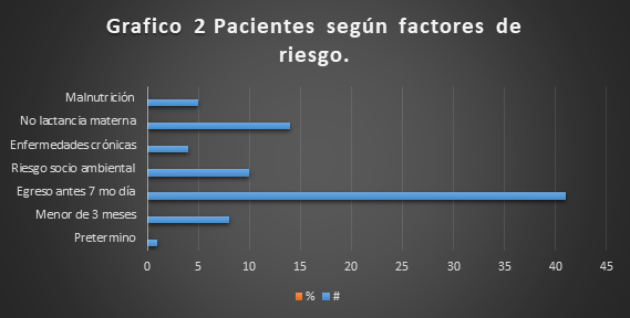 Gráfico 2. Los factores de riesgo según sepsis en la población pediátrica, donde el egreso hospitalario constituyó 60.2 %, seguido de la no lactancia materna para un 20.5 %.
