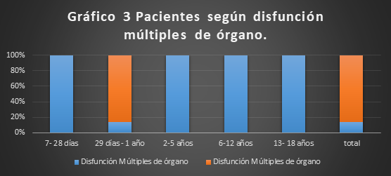 Gráfico 3. Se evaluaron un total de 68 pacientes con diagnóstico de sepsis al ingreso de ellos solo 16 desarrollaron disfunción múltiple de órganos siendo el grupo etáreo de 13 a 18 años el más afectado para un 37.5 %.