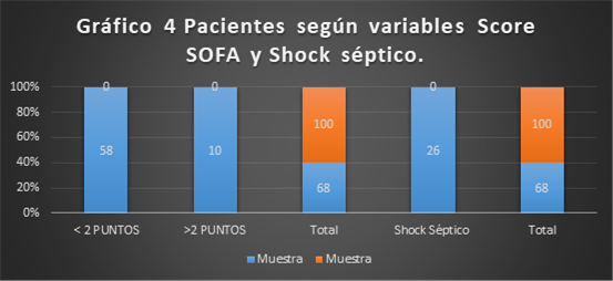 Gráfico 4. De un total de 68 pacientes con diagnóstico de sepsis al ingreso de ellos se evaluaron con un puntaje < 2 puntos 58 pacientes para un 85.2 % según escala de Score SOFA, reportando solo en 26 pacientes clínica de shock séptico.