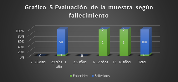 Gráfico 5. Del total de 68 pacientes con diagnóstico de sepsis al ingreso de ellos 6 pacientes no tuvieron una evolución favorable, siendo el grupo etáreo de 29 días a 1 años el más afectado con 3 pacientes para un 50 % de estos.
